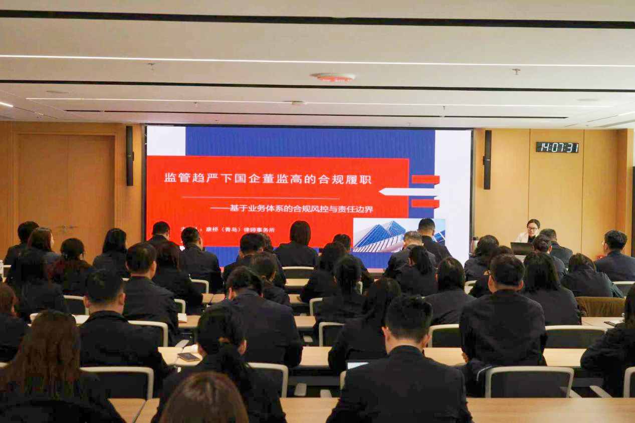3月20日,山东港口投控集团举办董监高履职尽责专题培训,集团领导,各直属单位企业管理条线分管领导、部门负责人及经办人员,各直属单位董事,委派参股单位董事及高管,金融发展部全体人员参加培训。康桥高级合伙人、青岛分所负责人邓莉受邀受邀作《监管趋严下国企董监高的合规履职——基于业务体系的合规风控与责任边界》专题授课。