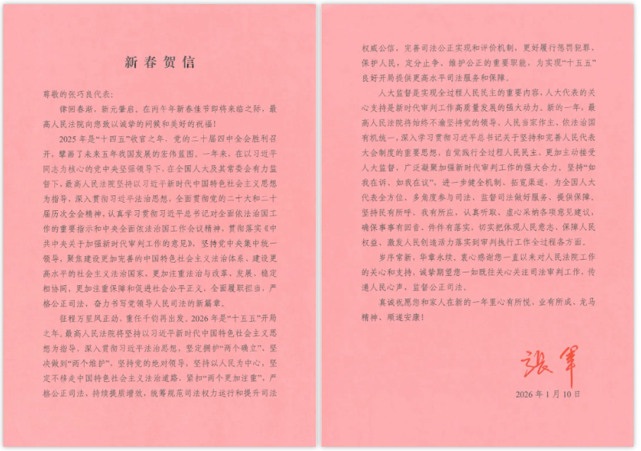 之后,双方进行了座谈。毕惠岩专委向张巧良代表送交了最高人民法院《新春贺信》,介绍了2025年度济南中院在审判执行、服务大局、队伍建设和司法改革等方面的工作情况和取得的成绩,并征求张巧良代表对法院工作的意见与建议。